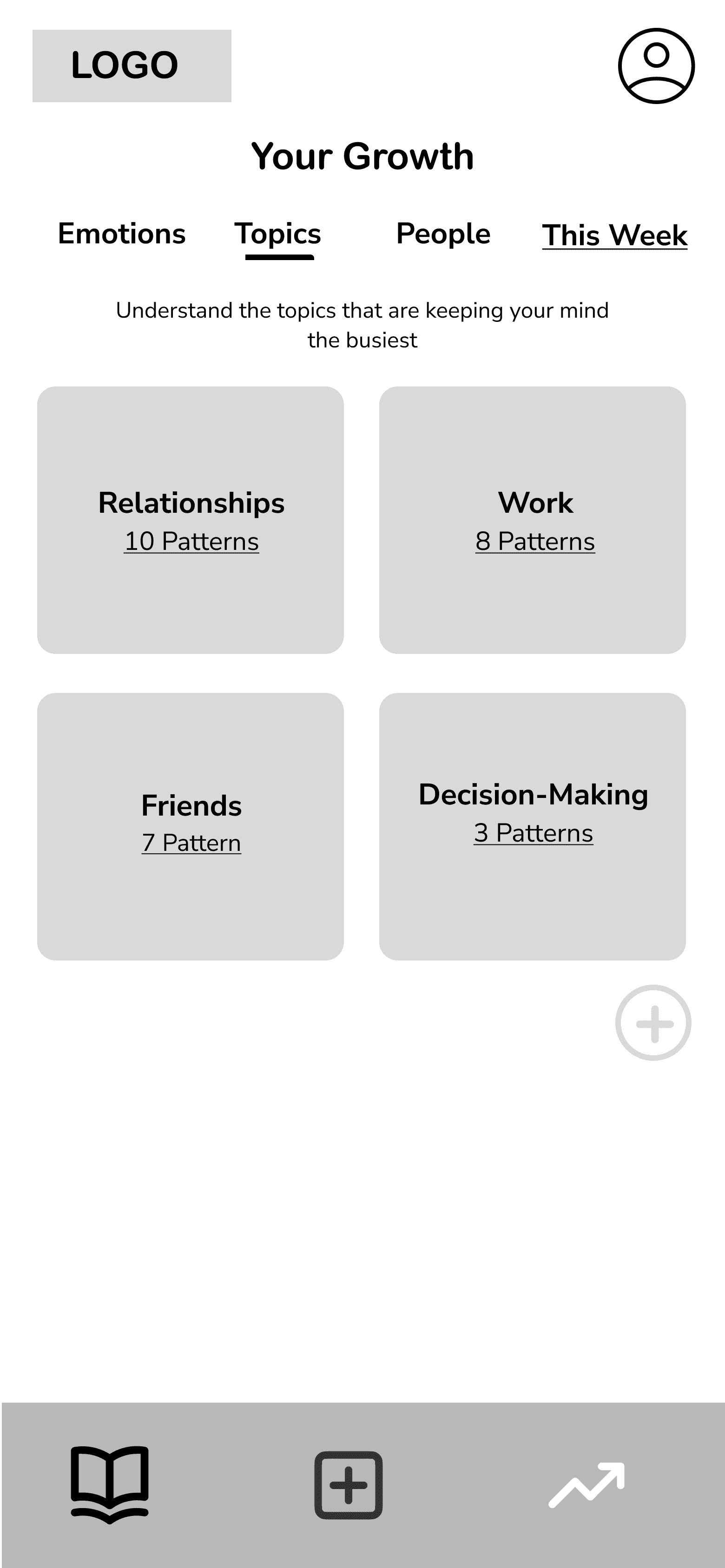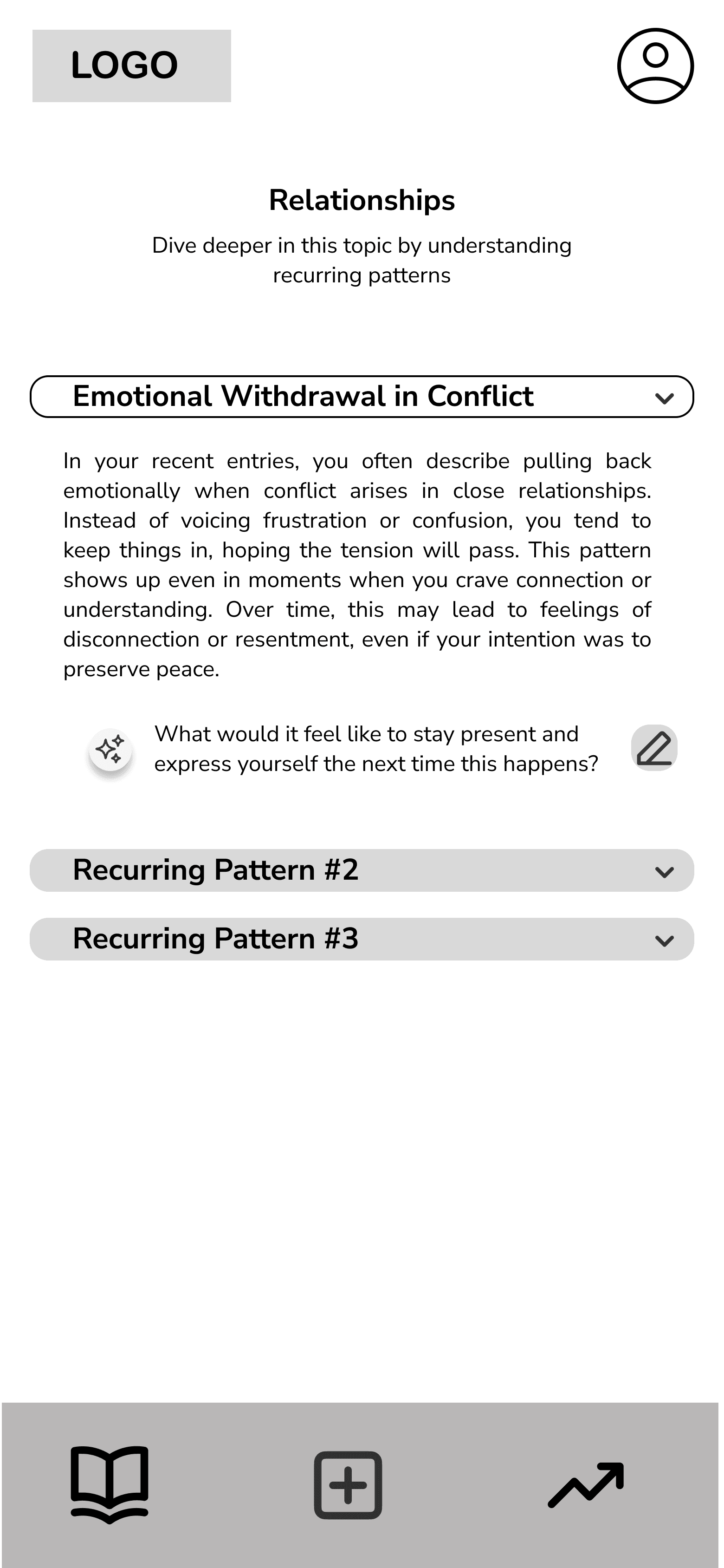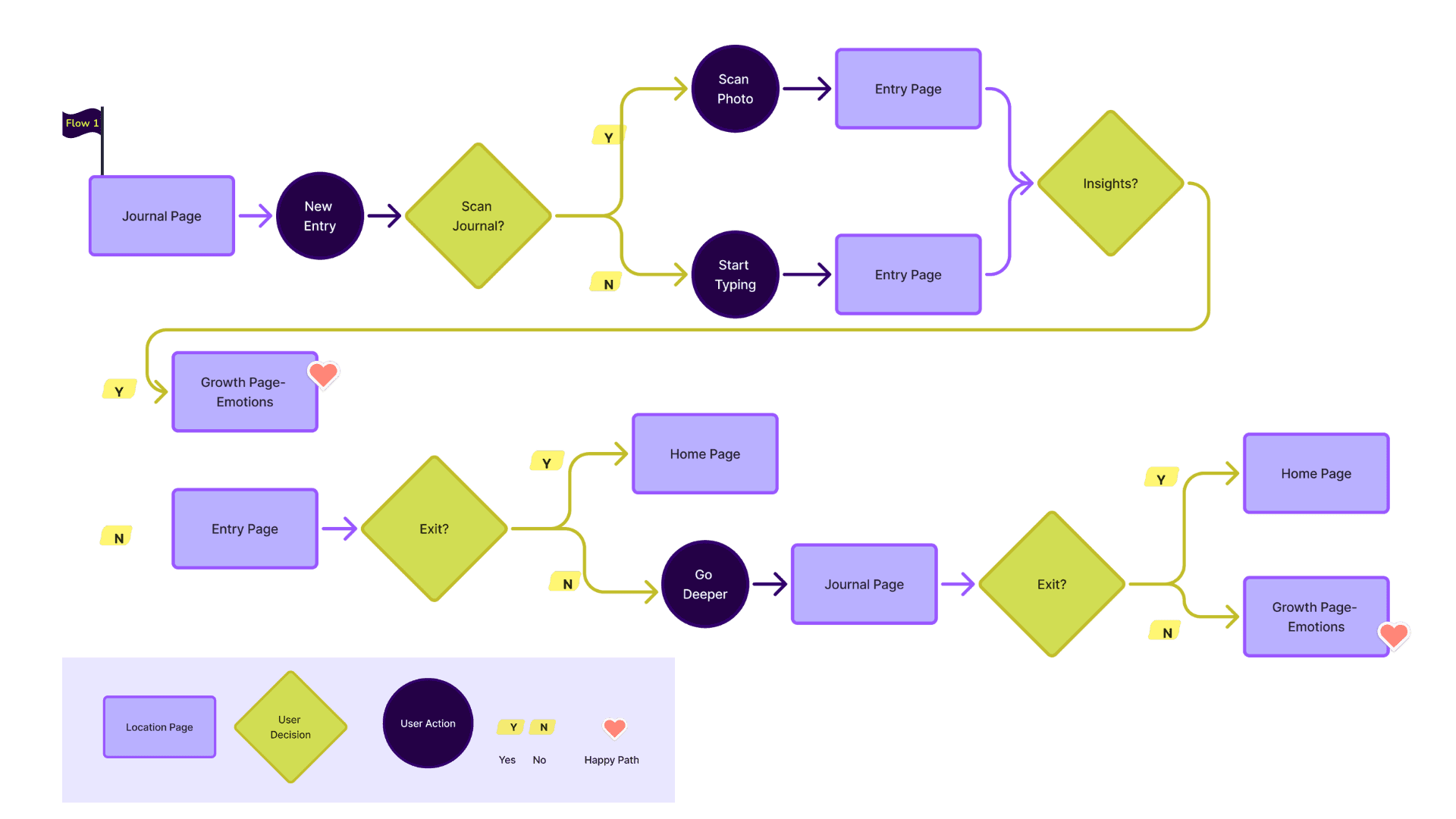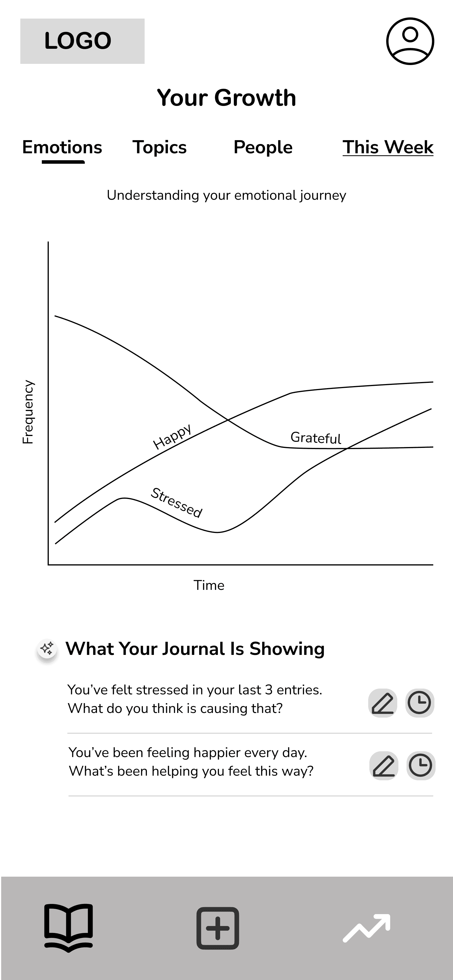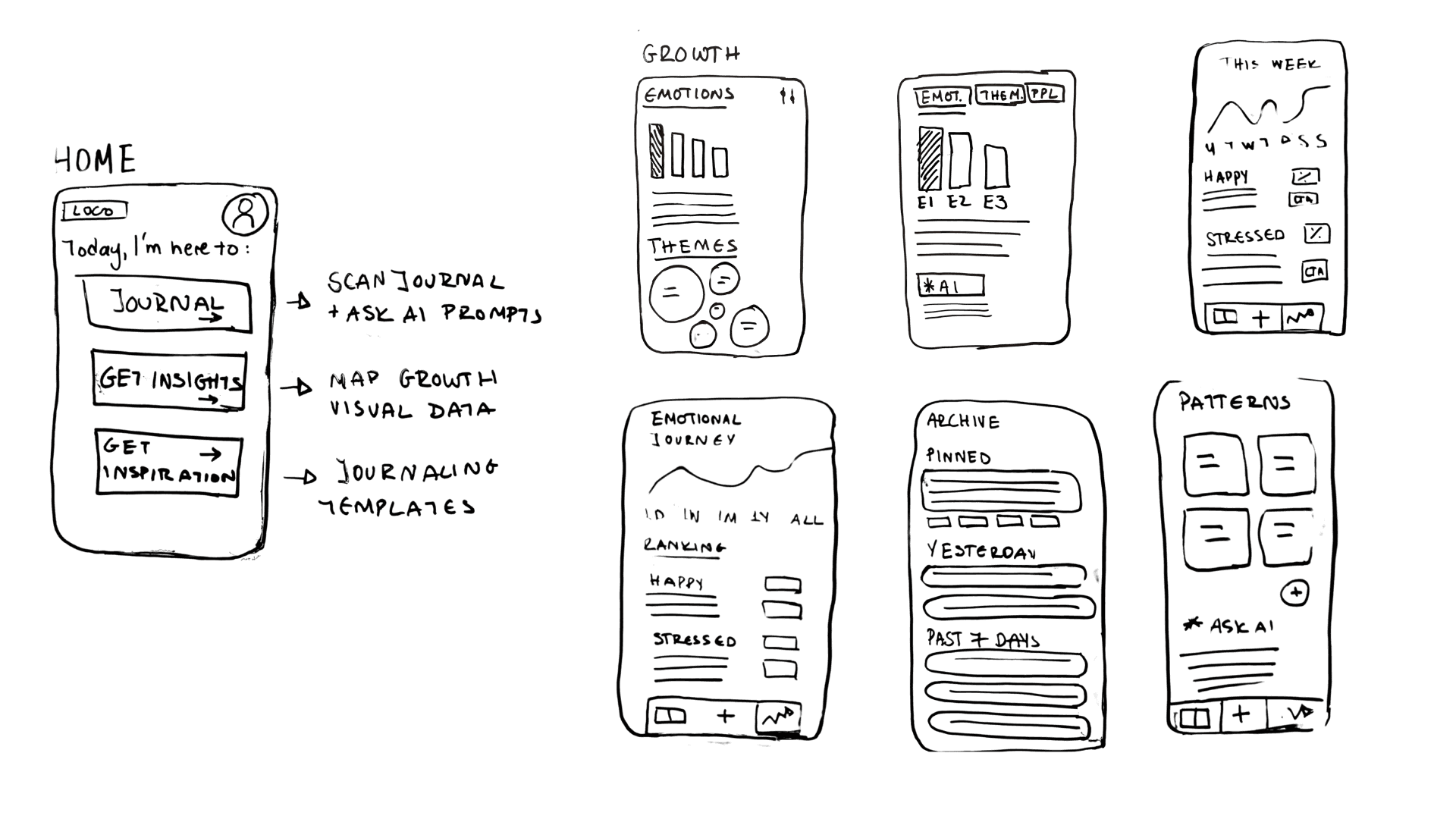 The ‘aha’ moments always came when my journal wasn’t around, so my reflections were scattered. I tested with fellow journalers and confirmed entries lived in voice notes, Notes, and scraps of paper. But research revealed a deeper need: analog journalers craved growth, a way to revisit, decode emotional loops, and receive personalized prompts.